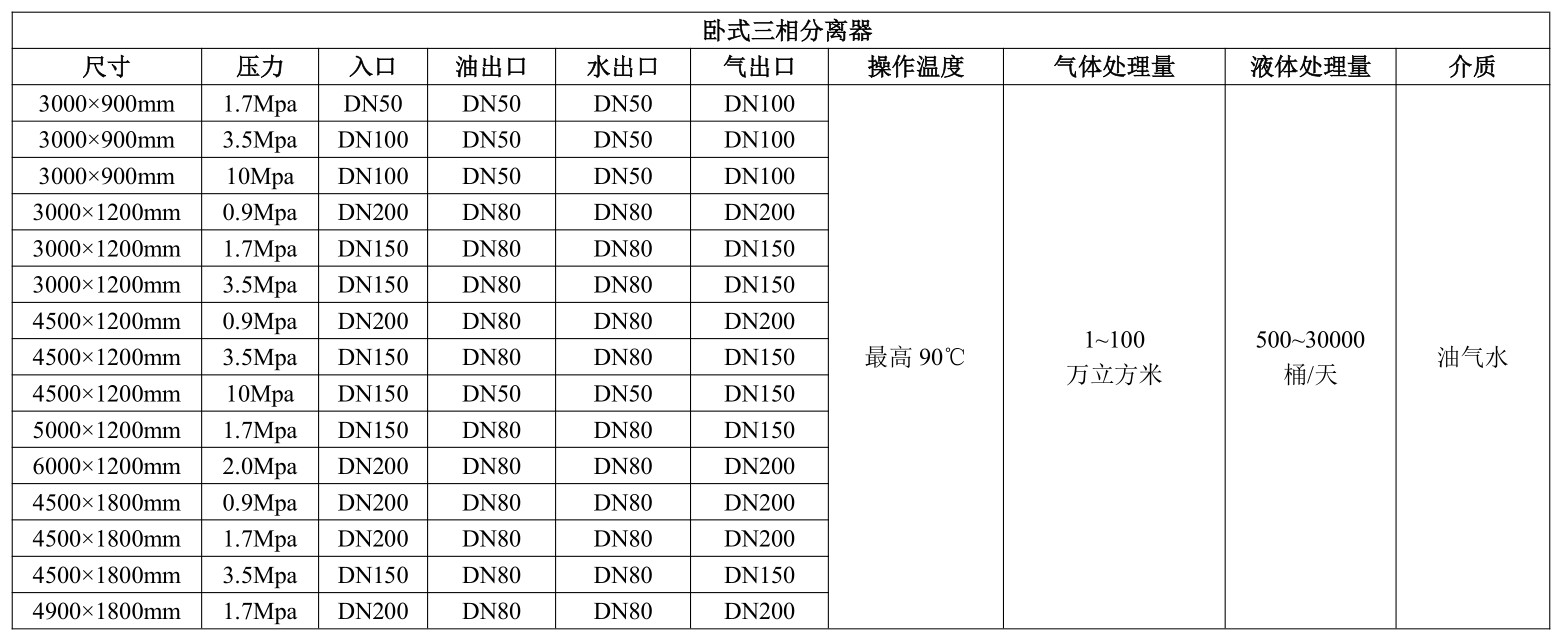 按照形態(tài)來分,油氣水三相分離器一般分為臥式和立式,臥式分離器通常用于較大的液/氣比流體的處理,或液/液分離。與立式分離器相比,臥式分離器的液體流動的水平截面積較大,不同密度液體的重力分離的垂直段較短。目前國內(nèi)常用的的形態(tài)為臥式分離器。
